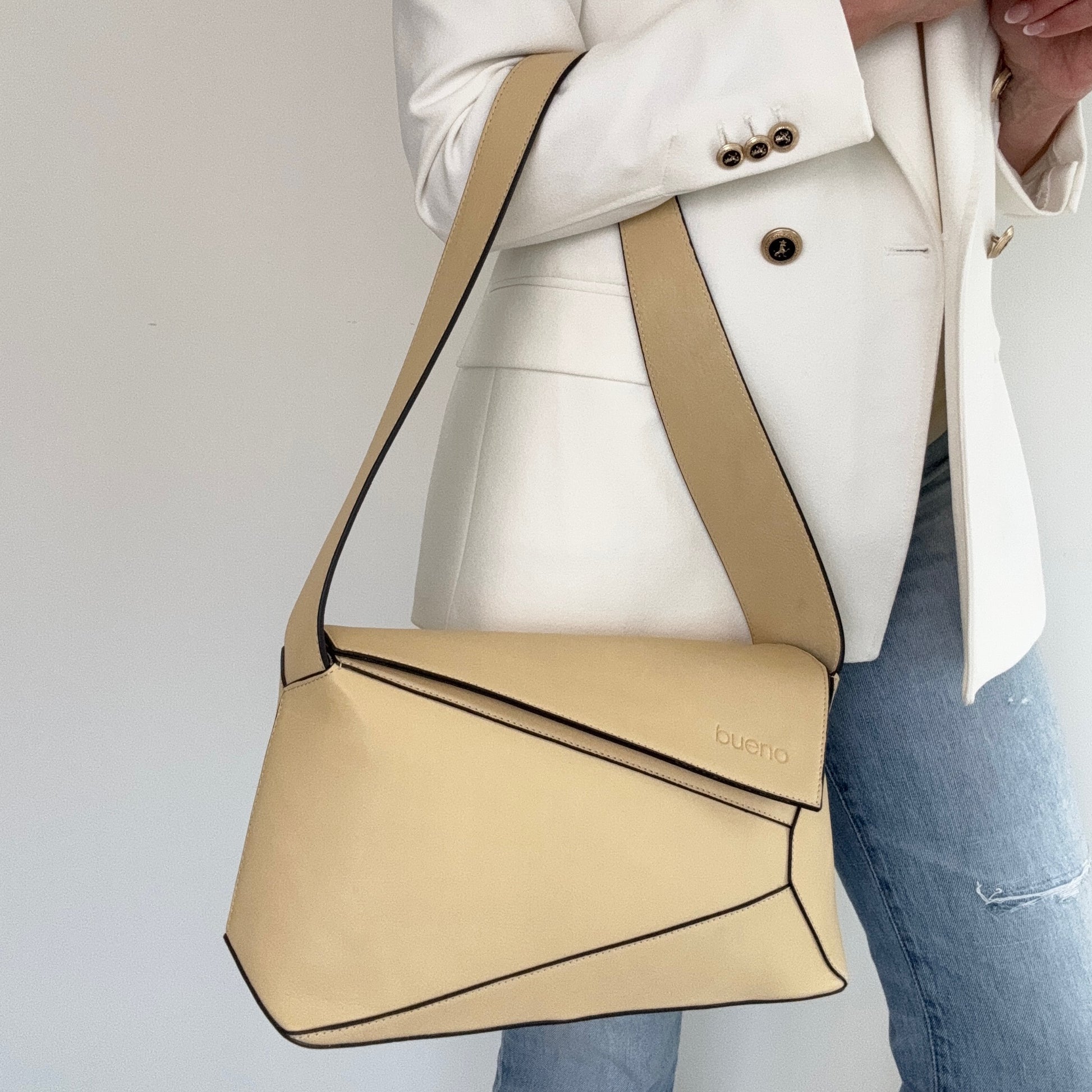 Beautiful, modern structured leather handbag. Made in Spain. Large interior compartment with zippered outer pocket. Shoulder strap.