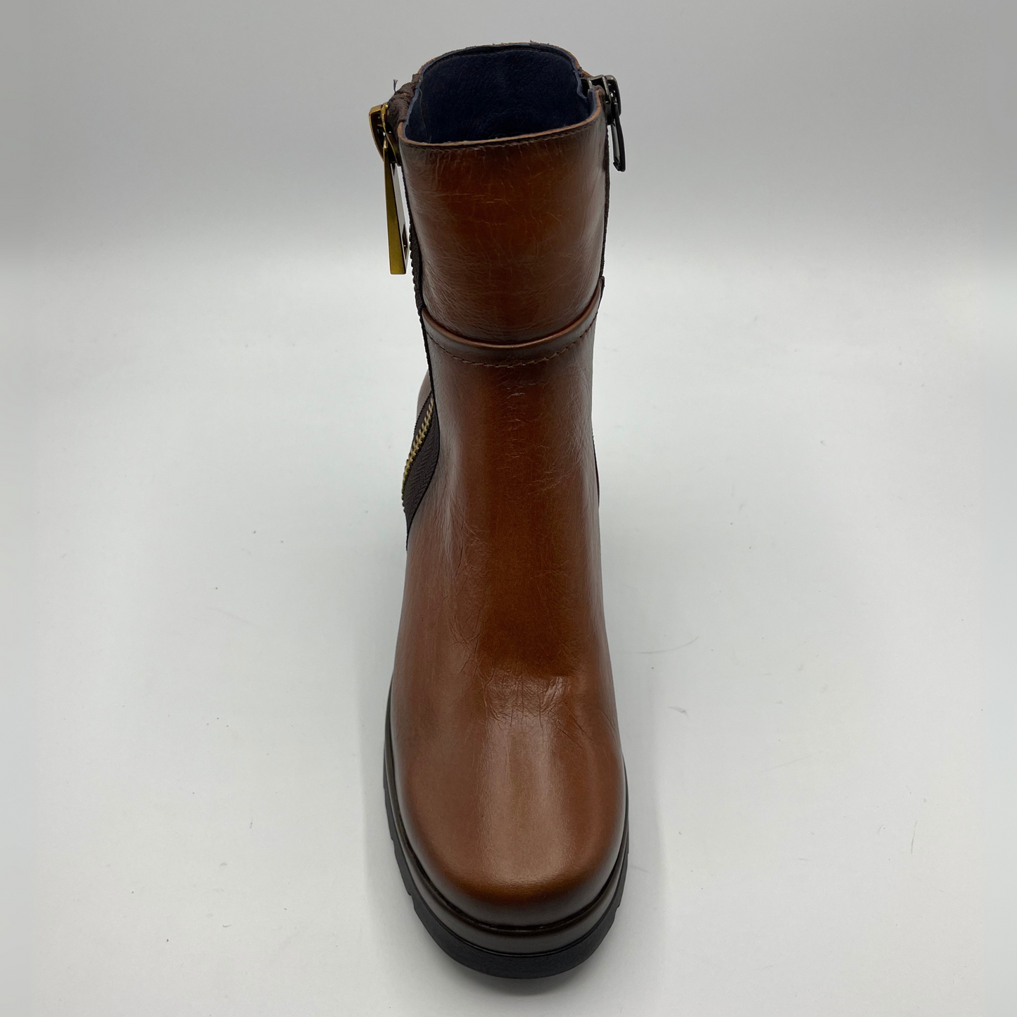 The Dorking Safe ankle boot combines refined style with practical design for cooler seasons. Crafted from brown, black, or beige leather, it features an internal zip for easy fastening and an external zip as a chic accent. The wide 8 cm heel paired with a 2.5 cm front platform offers elegant height and stability. A synthetic rubber sole ensures dependable traction on wet surfaces, while the textile lining enhances comfort and breathability throughout wear.