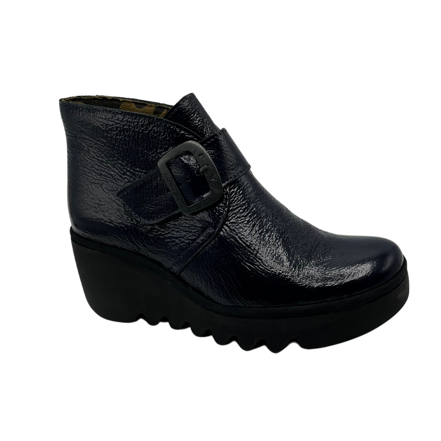 This beautiful navy patent ankle bootie sits on a classic Fly wedge sole. It has a gorgeous strap detail with a metal buckle. it has a cushioned insole for all day comfort. Add a stylish pop to your everyday jeans.